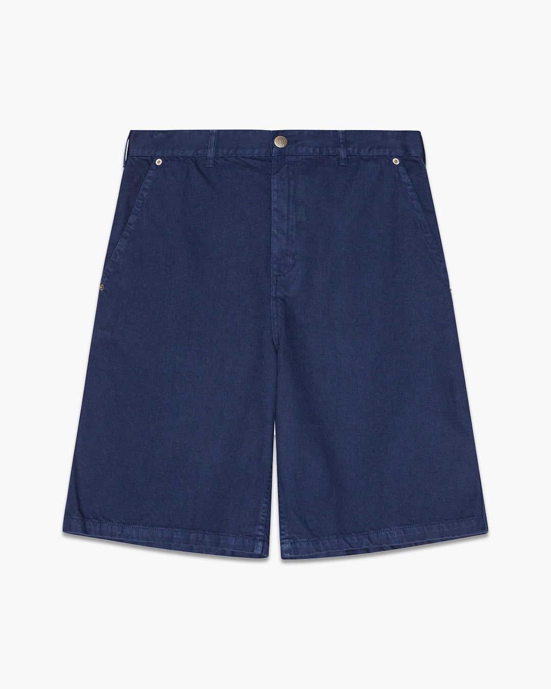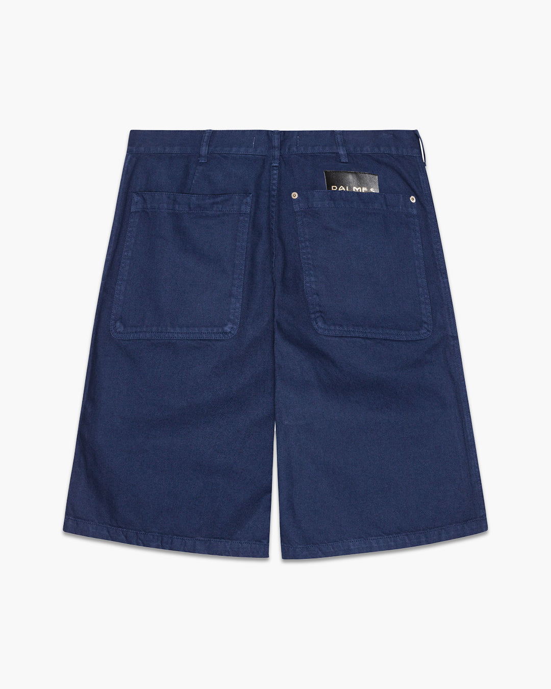 Blue Twill Patch Shorts by Palmes. Crafted from 100% Cotton. Featuring a leather patch on the back pocket. Slash front pockets, back patch pockets, and a regular fit.