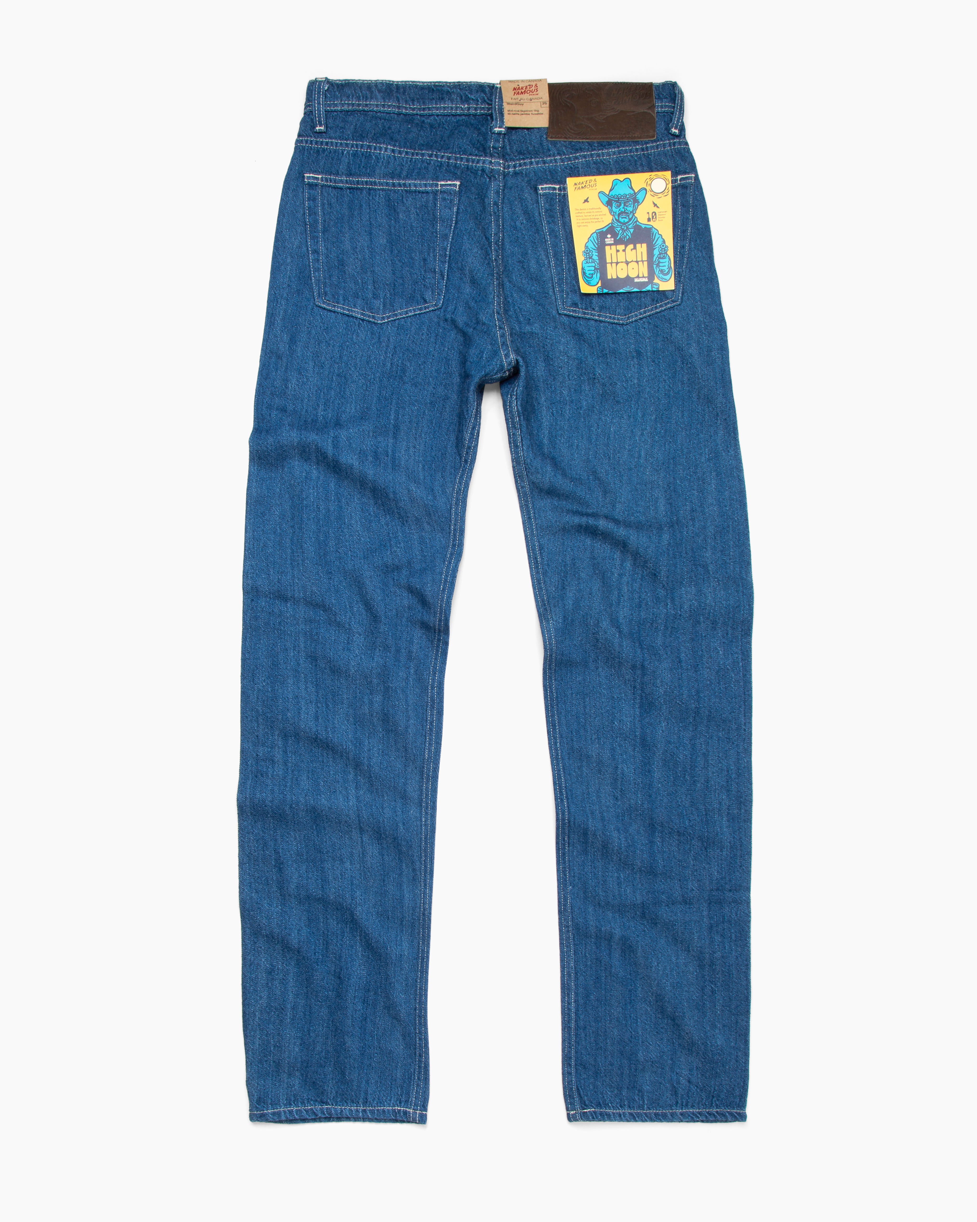 The Weird Guy Jean in High Noon selvedge denim by Naked & Famous features lightweight 10oz Japanese selvedge with a light indigo hue and textured, soft hand-washed feel. Inspired by early 1900s workwear, it offers breathability and durability. Pre-washed to prevent shrinkage, it has a medium rise, tapered leg, button fly, five pockets, and signature hardware with a branded leather patch.