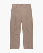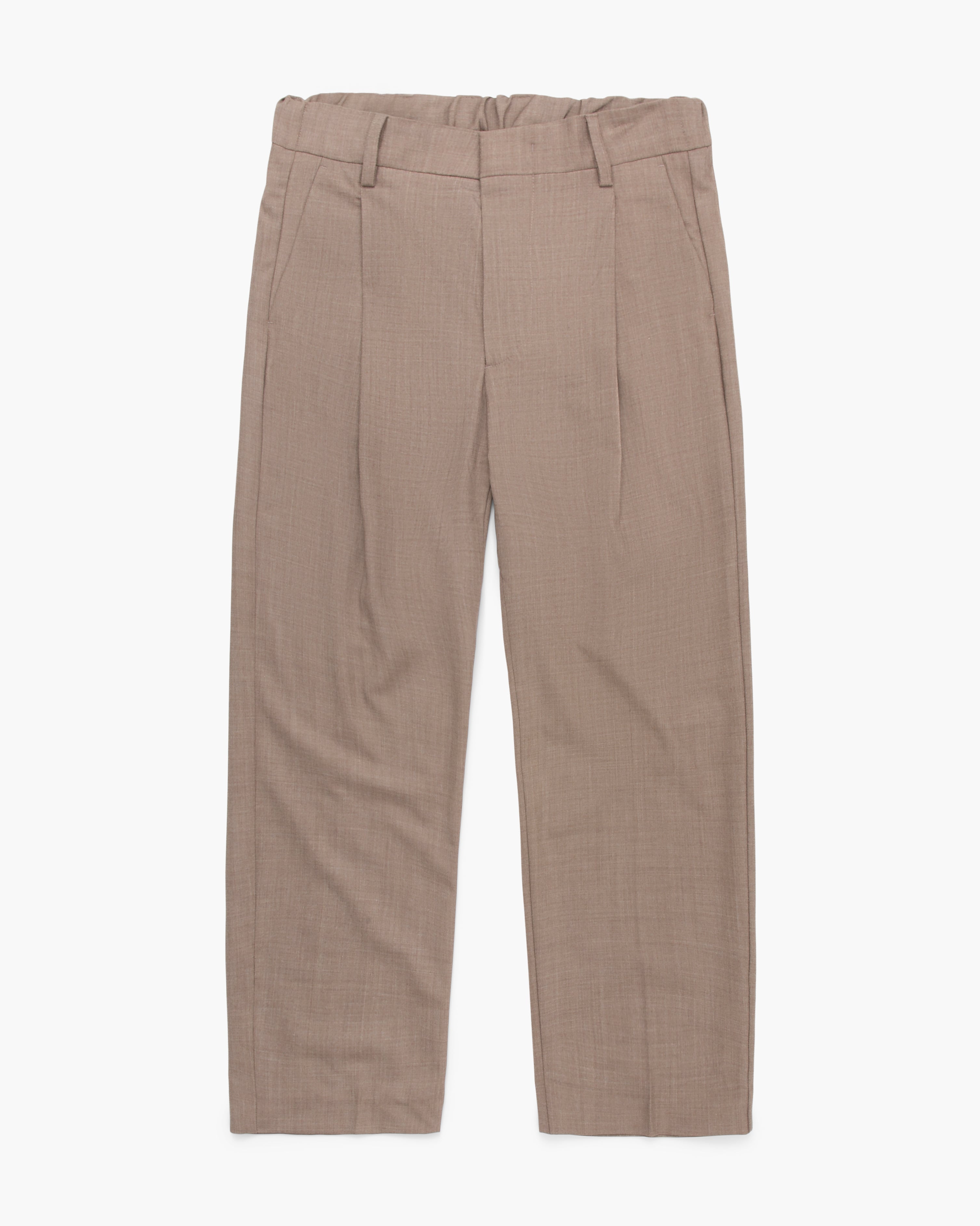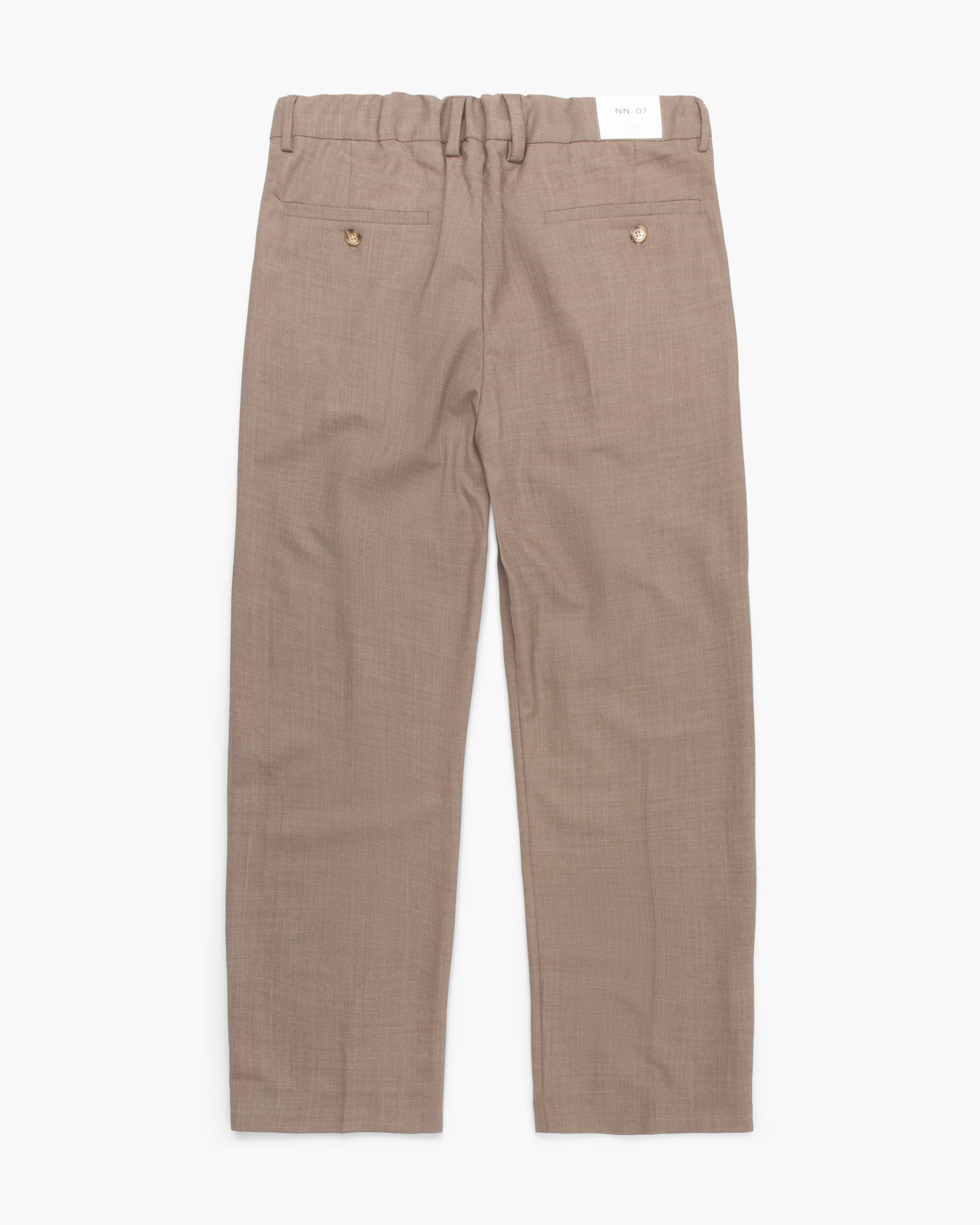 Khaki Kay Pants by NN07 in tweed-look fabric with silk finish. Features front pleats, hook-and-bar closure, and relaxed straight-leg fit. Made with recycled fibers.