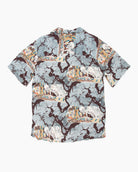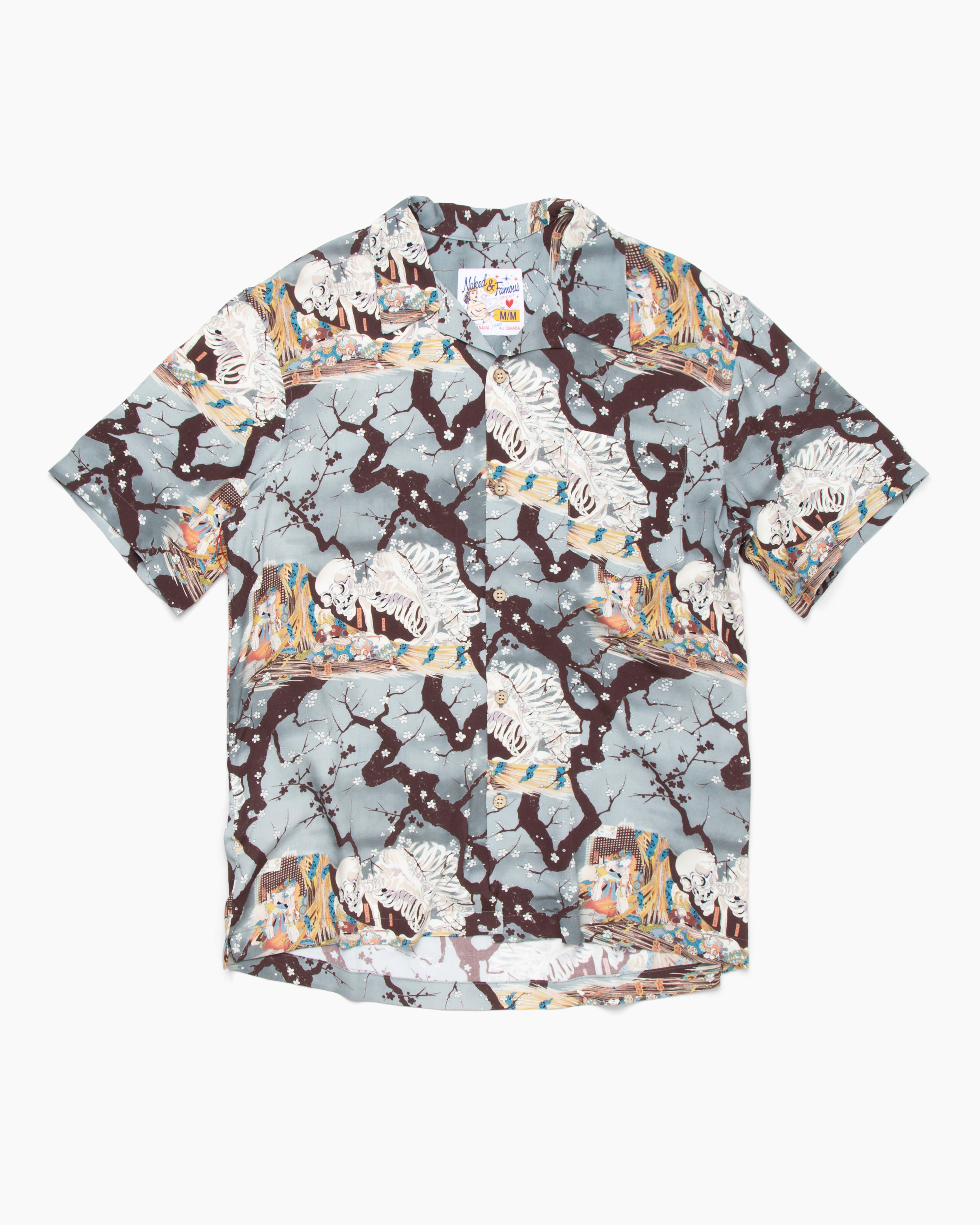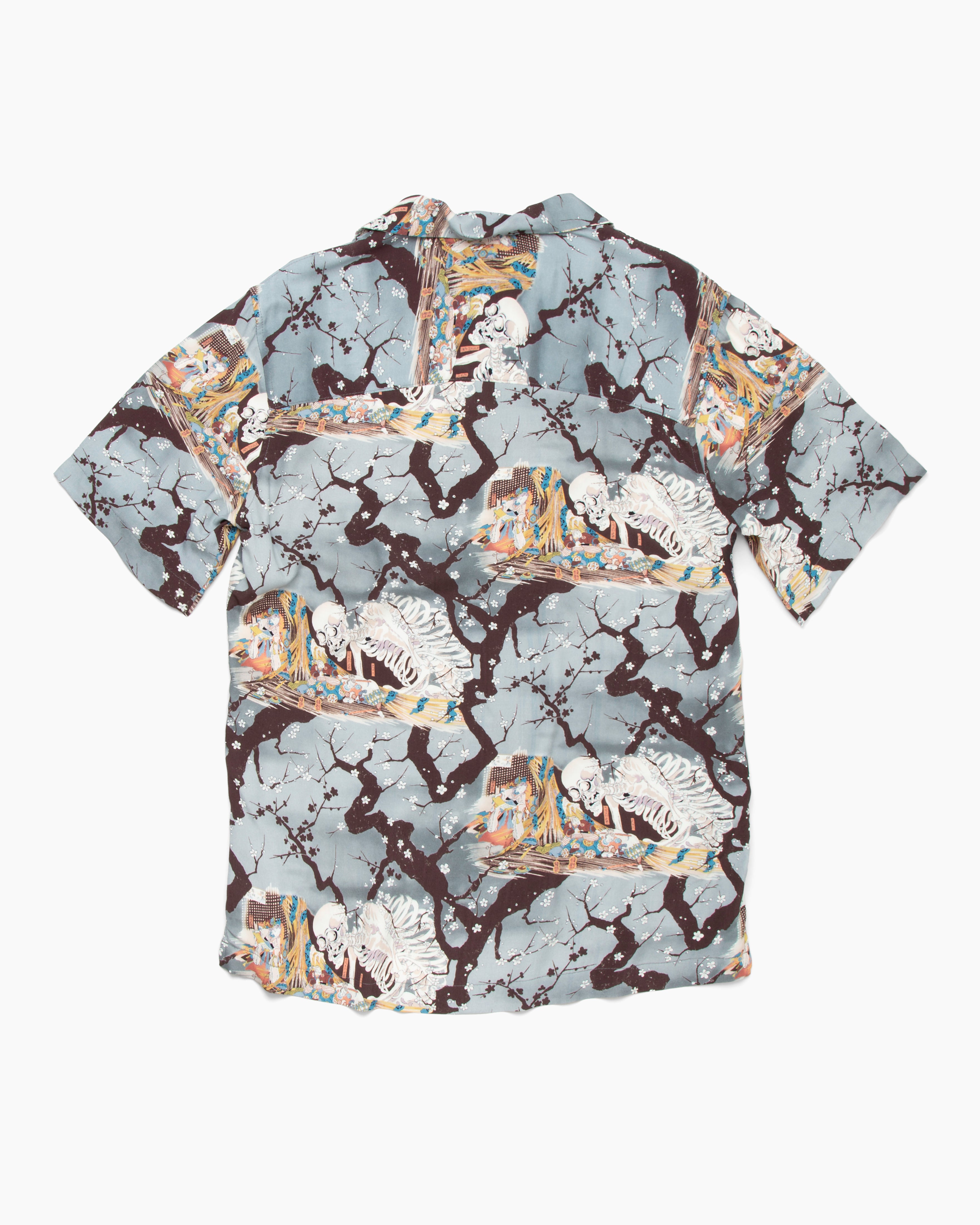 The Skeletons Aloha Shirt in blue by Naked & Famous is made from lightweight 100% rayon Japanese fabric, known for its unique drape. It features a large traditional Japanese Ukiyoe print. This short-sleeve shirt has a boxy fit, camp collar, chest pocket, and coconut buttons. Made in Canada.