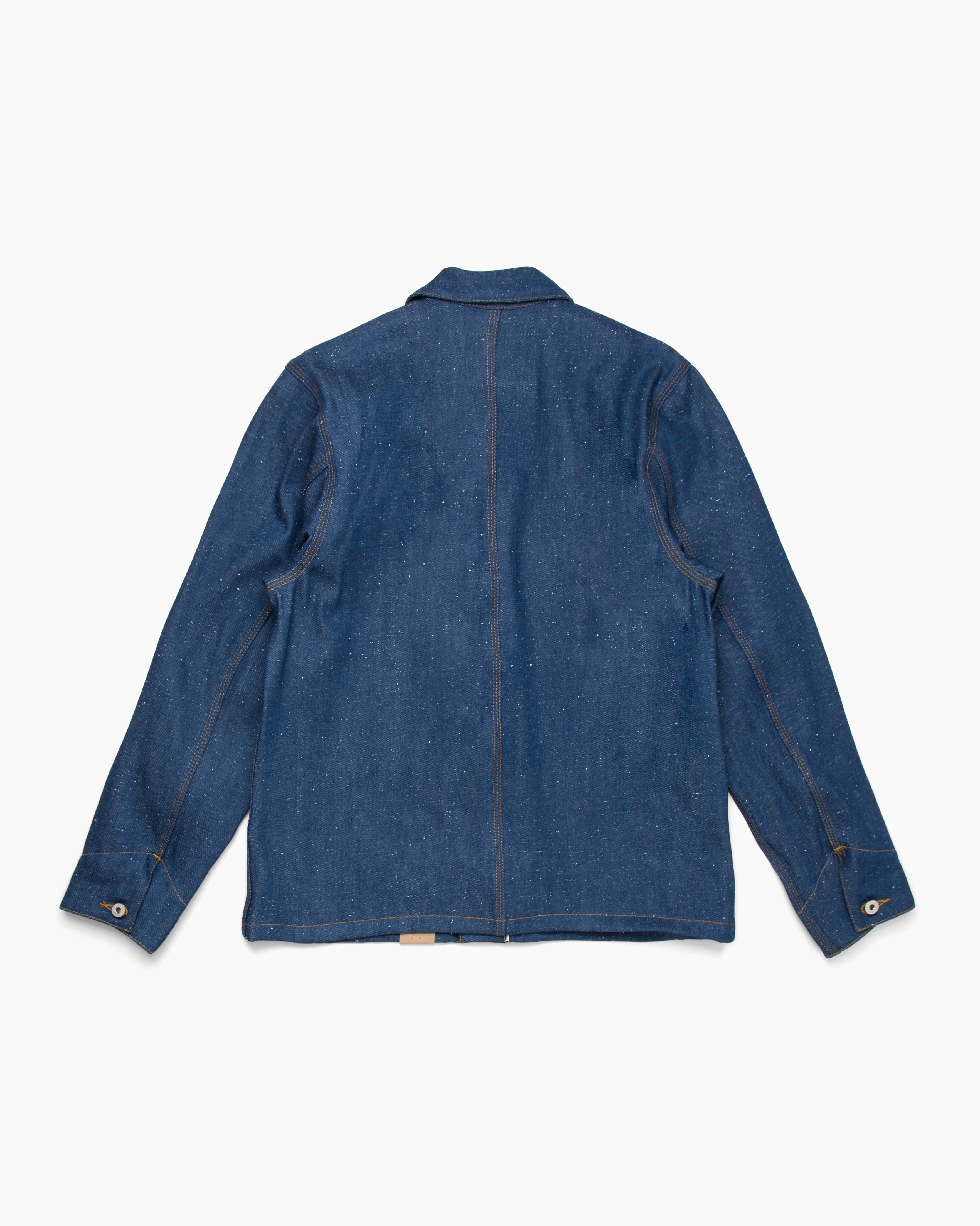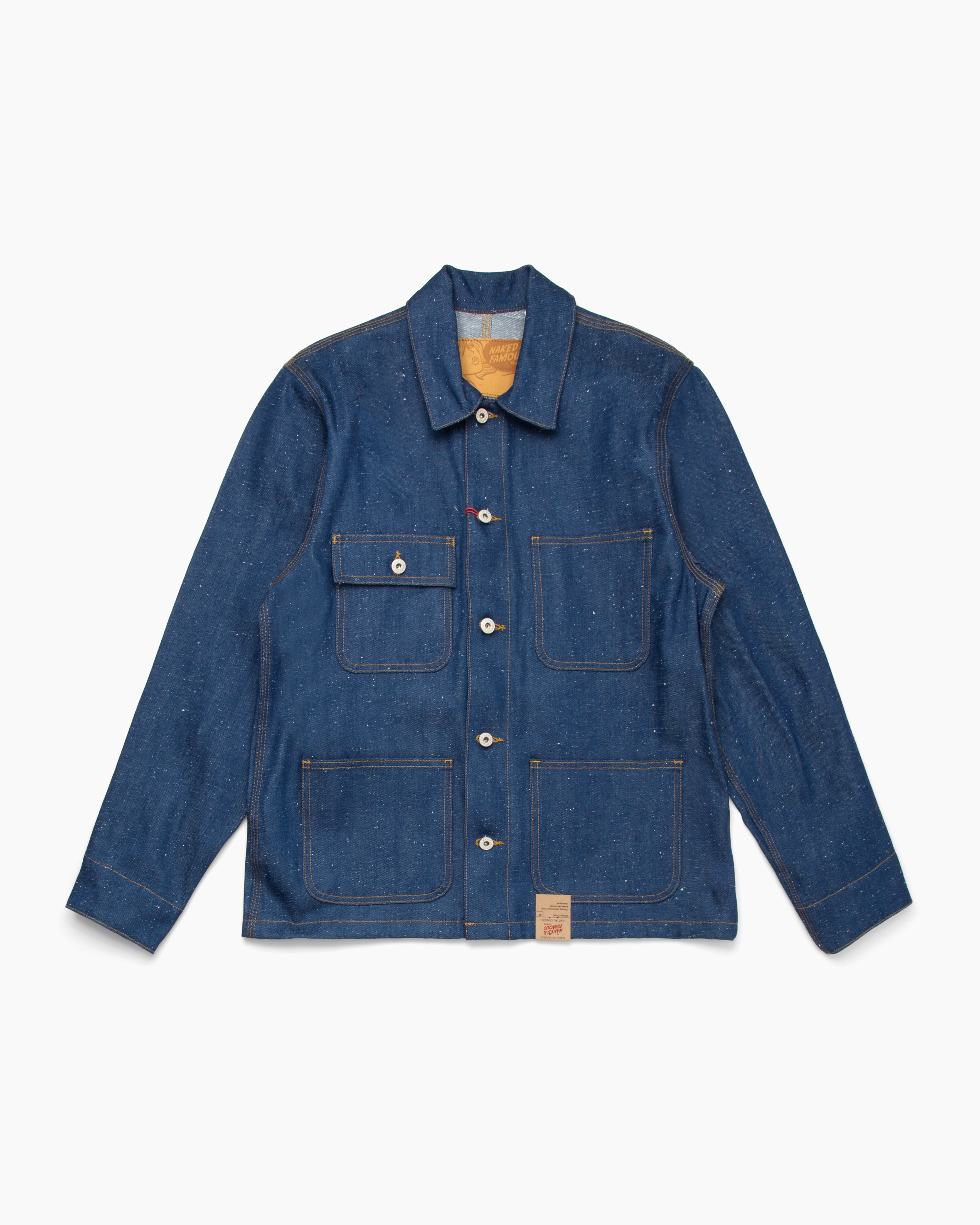 The Workforce Chore Coat is made from lightweight 10.9oz Japanese selvedge denim with a classic blue tone and vintage details like slubby yarn and a blue line selvedge ID. Crafted from 100% cotton, it softens quickly for comfort. This workwear coat features a relaxed fit, two chest patch pockets, and two large hip pockets. Made in Canada with contrast stitching and silver hardware.