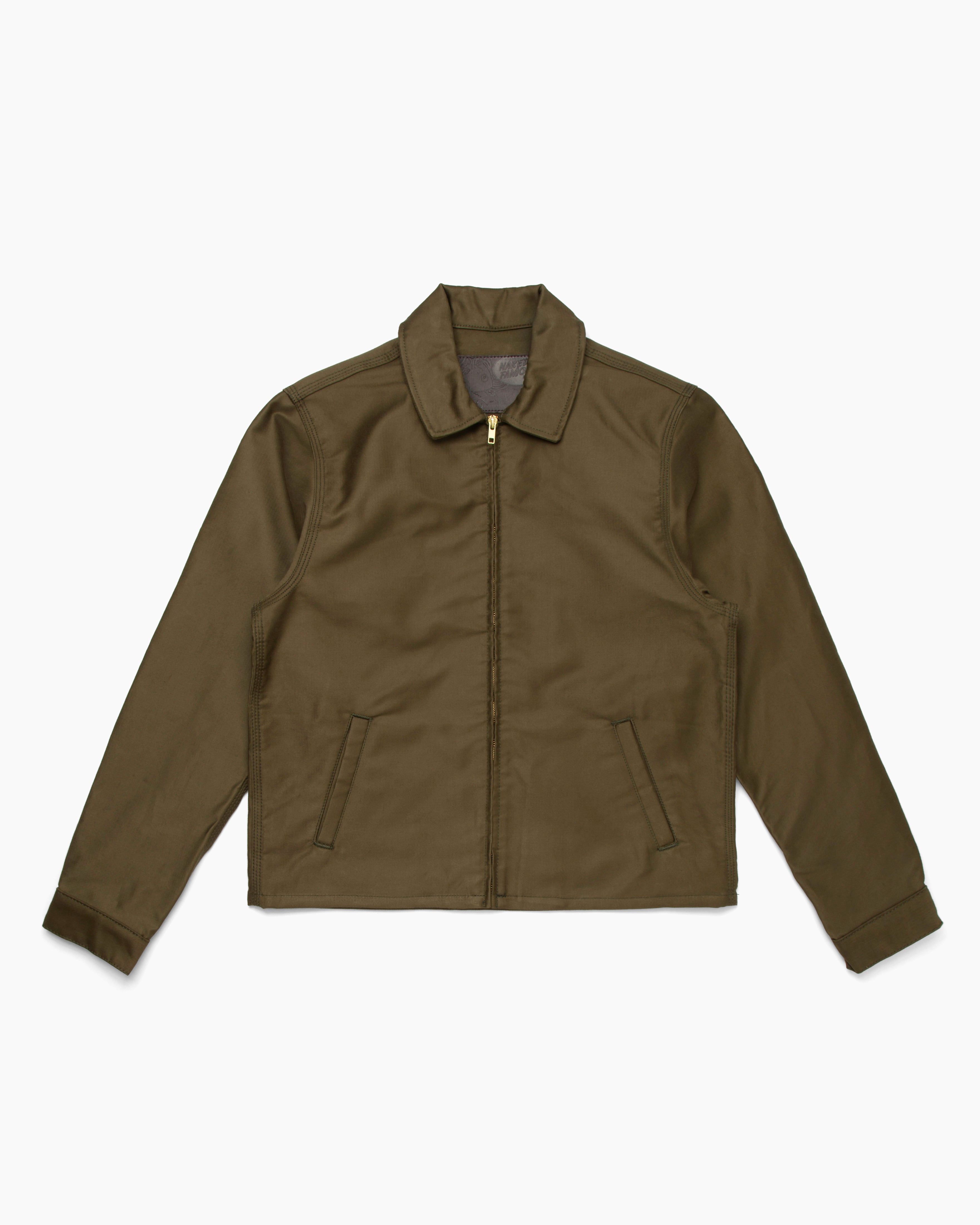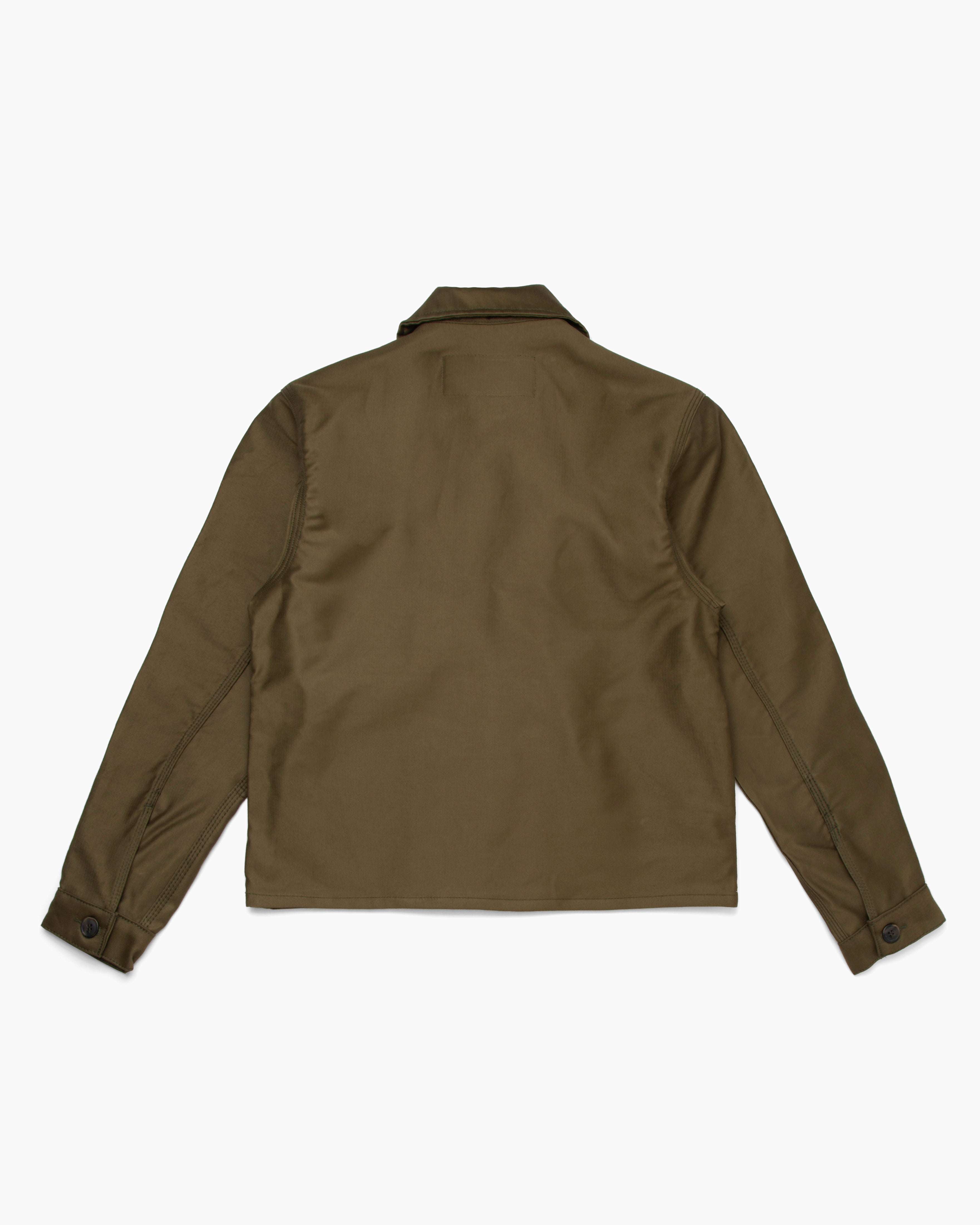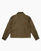 The Zip Jacket in army green by Naked & Famous is made from Japanese Brushed Jungle Cloth, a mini-wale uncut corduroy with a soft brushed interior. Initially stiff, it softens with wear and washing. This classic fit jacket features a front zip, side welt pockets, and triple-stitched seams for added durability.