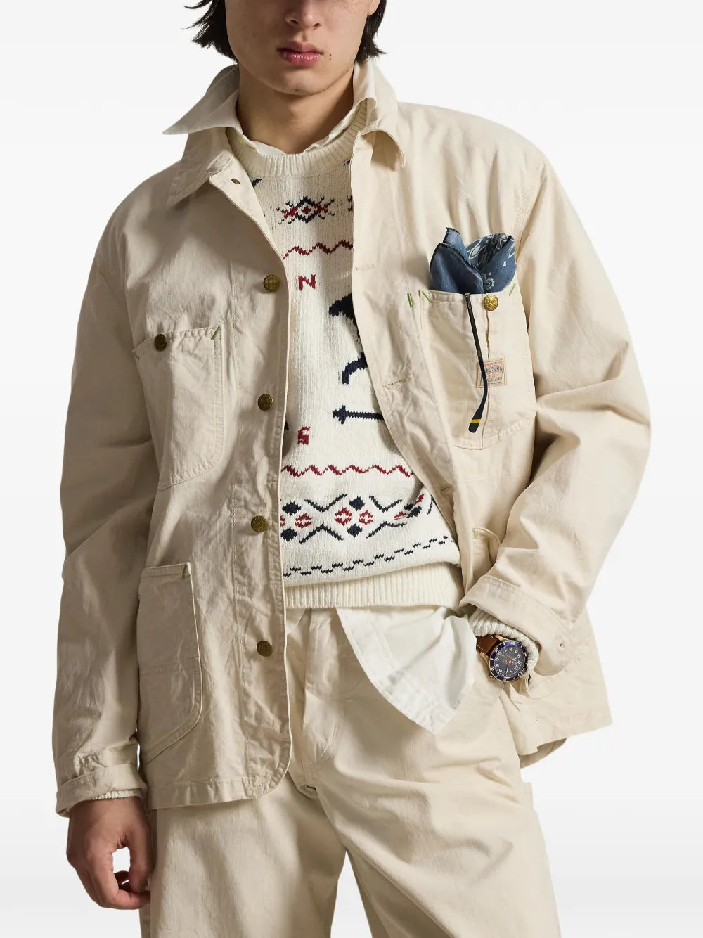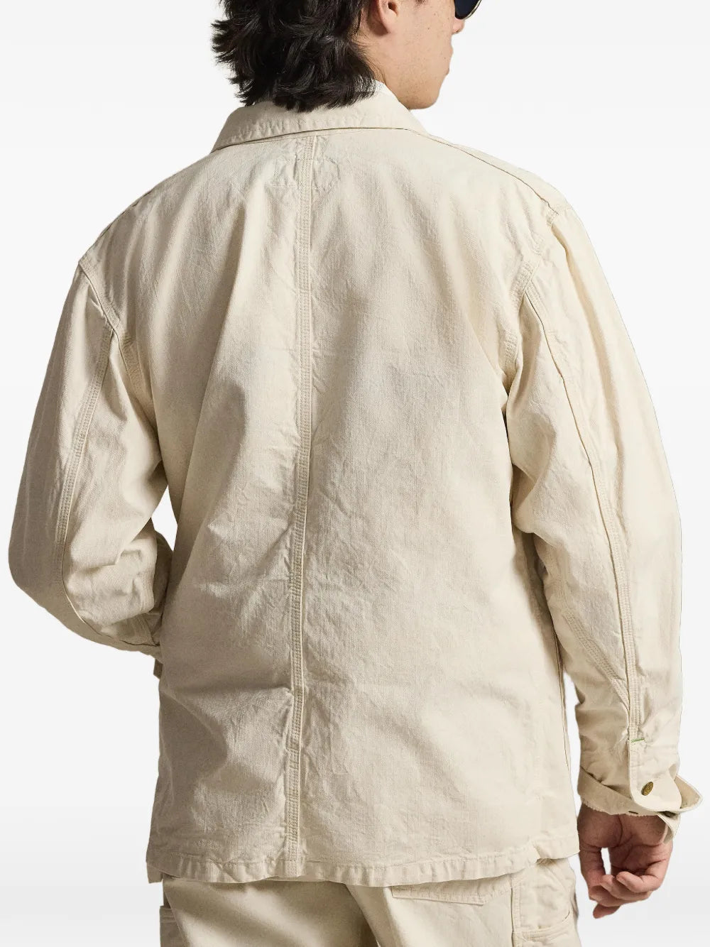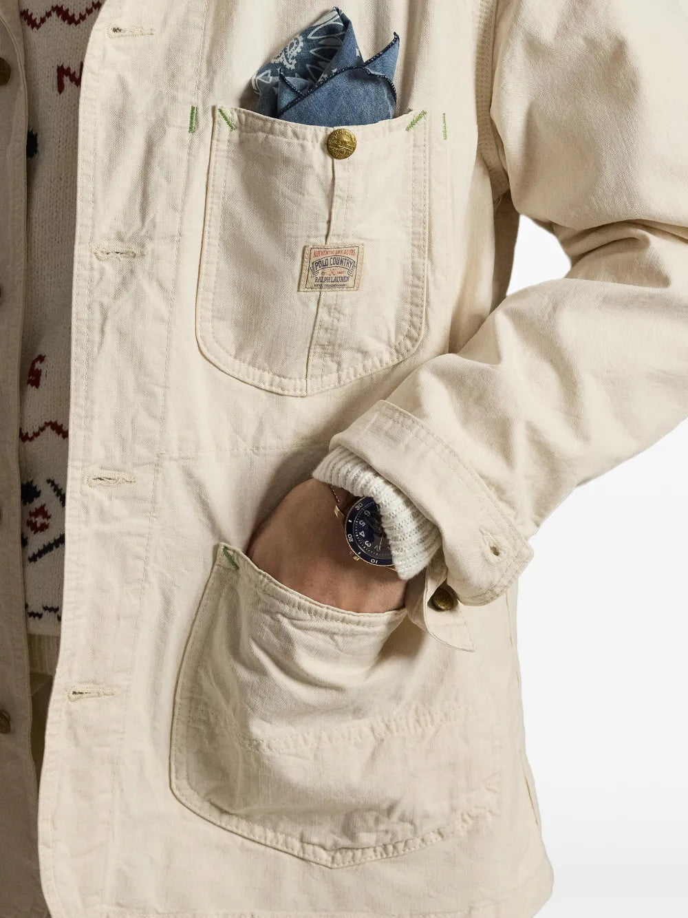 Woven Field Jacket by Polo in barlows cream. White button front, patch pockets, topstitched seams, and chest logo patch.