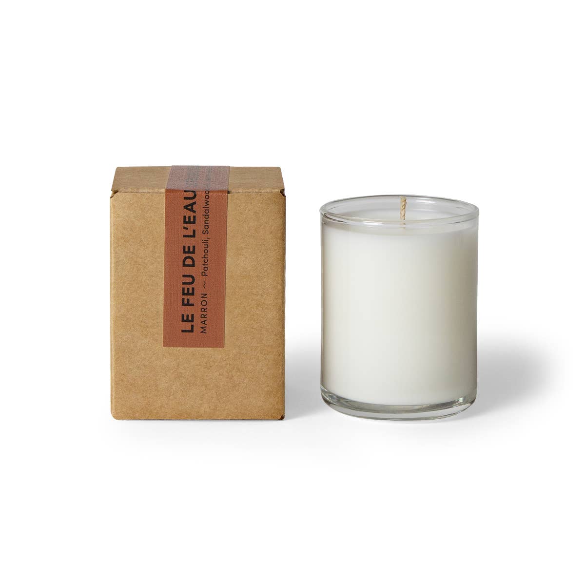 Glass votive candle with patchouli, sandalwood, and vanilla. Warm, woodsy scent with amber notes. Small-batch poured in Los Angeles.