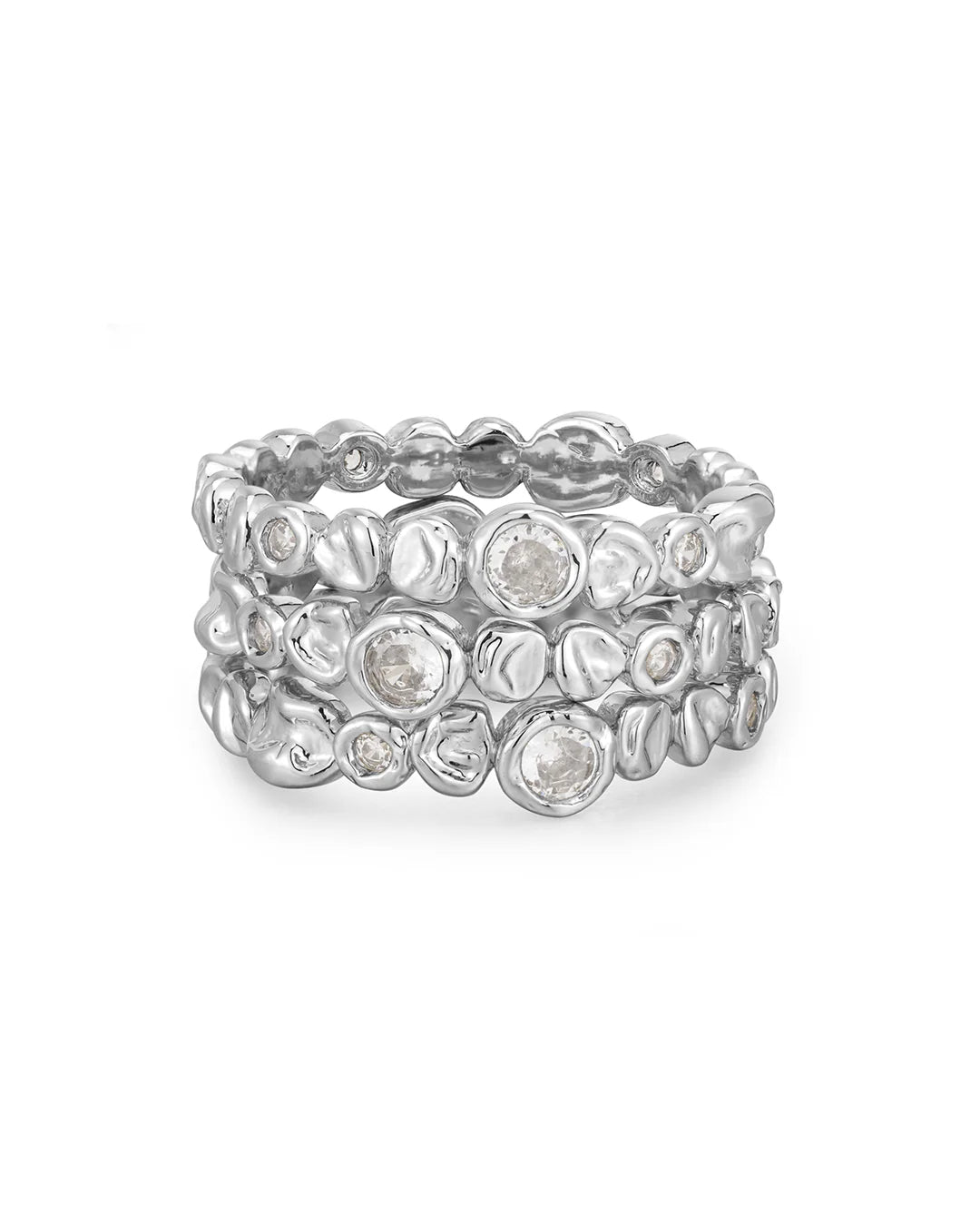 Eclectic Stud Ring Set in silverby Luv Aj. Includes three textured bands with bezeled CZ Stones, hammered metal discs, and faux pearl studs.