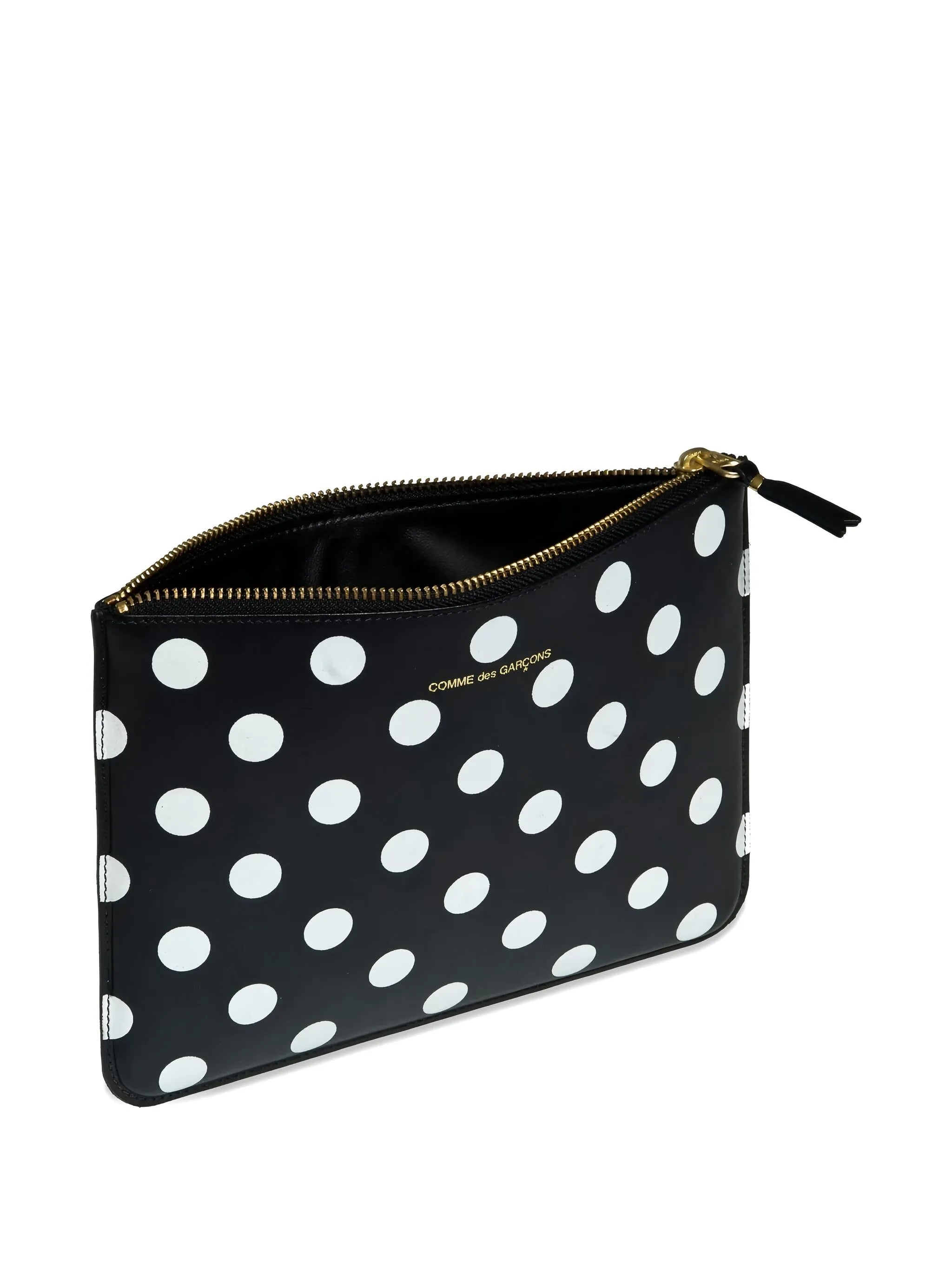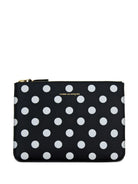 The Large Polka Dots Wallet by Comme des Garçons features a black and white design with a zip closure and gold-tone hardware. It includes a logo print and is crafted from 100% leather. Dimensions: 8.46" L x 6.29" W.