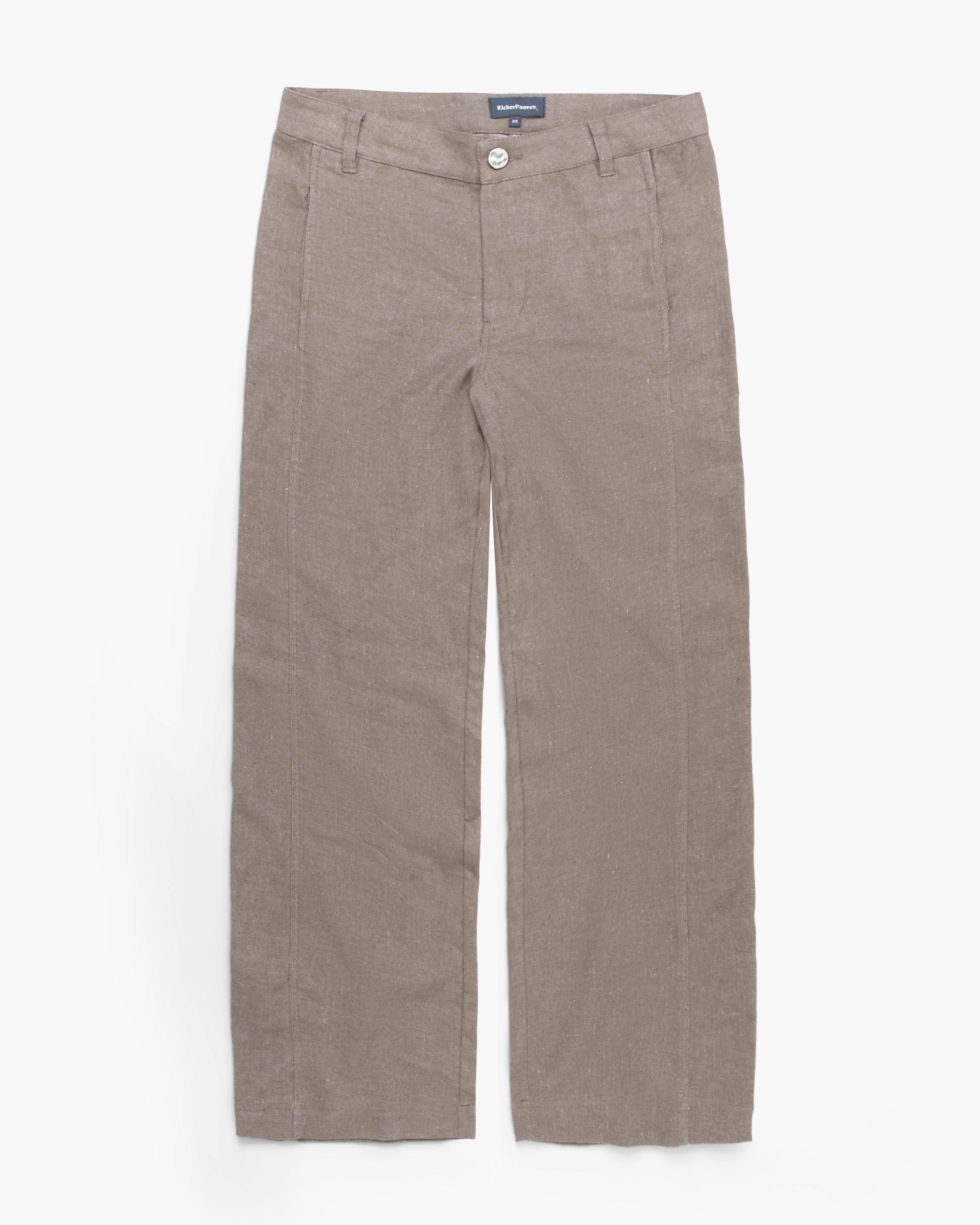 Roma Work Pant in porcini by Richer Poorer. Relaxed straight-leg style crafted from soft yarn-dyed cotton/linen twill woven in Italy. High-rise cut with functional zip fly, side panel detail, and on-seam pockets for an effortless, comfortable fit.