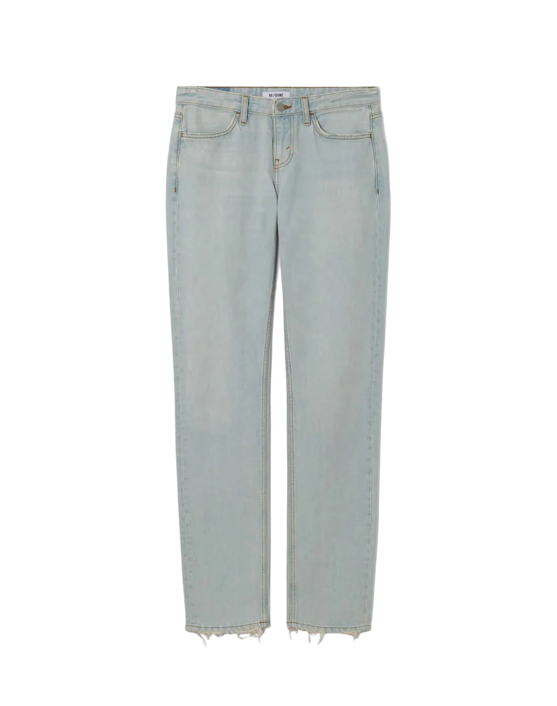 Snatch Back Straight Jean in bleach distress by RE/DONE. Mid-low rise, straight-leg silhouette with a fitted hip and streamlined leg. Crafted from rigid Italian denim in a clean bleach wash with distressed detailing at the waistband and hem. No-stretch construction delivers that authentic vintage feel.