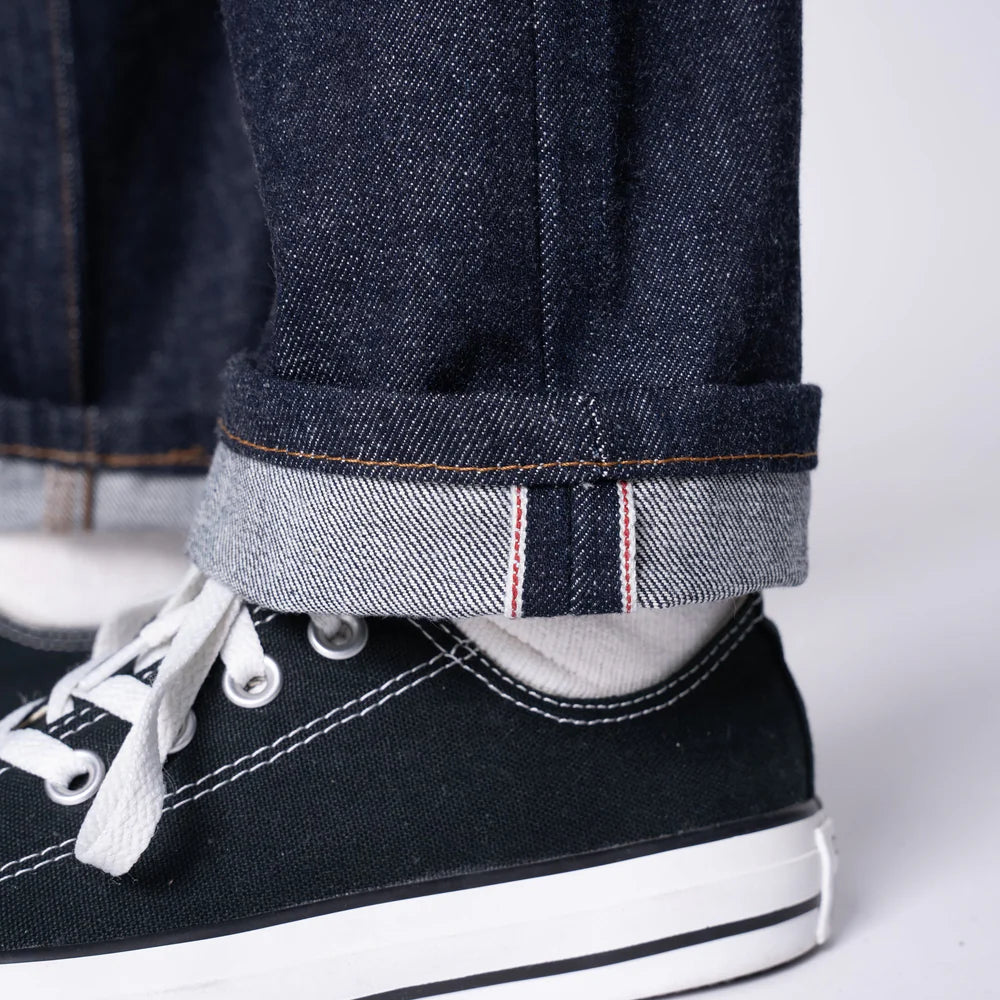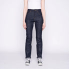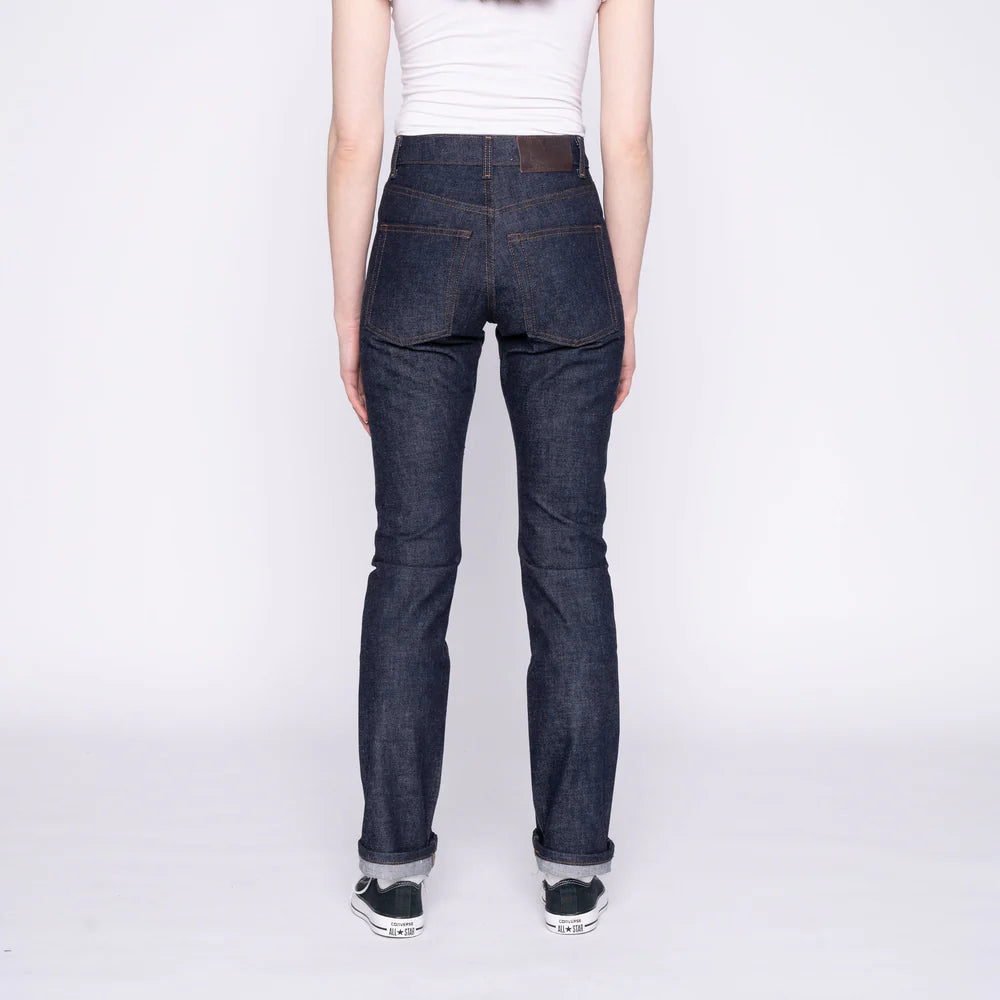 Arrow Blue Wave Selvedge indigo denim by Naked & Famous. This 12.5oz Japanese selvedge features a one-wash treatment that softens the fabric while preserving raw denim's fading potential. The fabric rinse reduces shrinkage and puckering for cleaner construction. Slim straight fit with high rise, slim thighs, and straight leg. Custom silver hardware and brown leather patch complete the design.