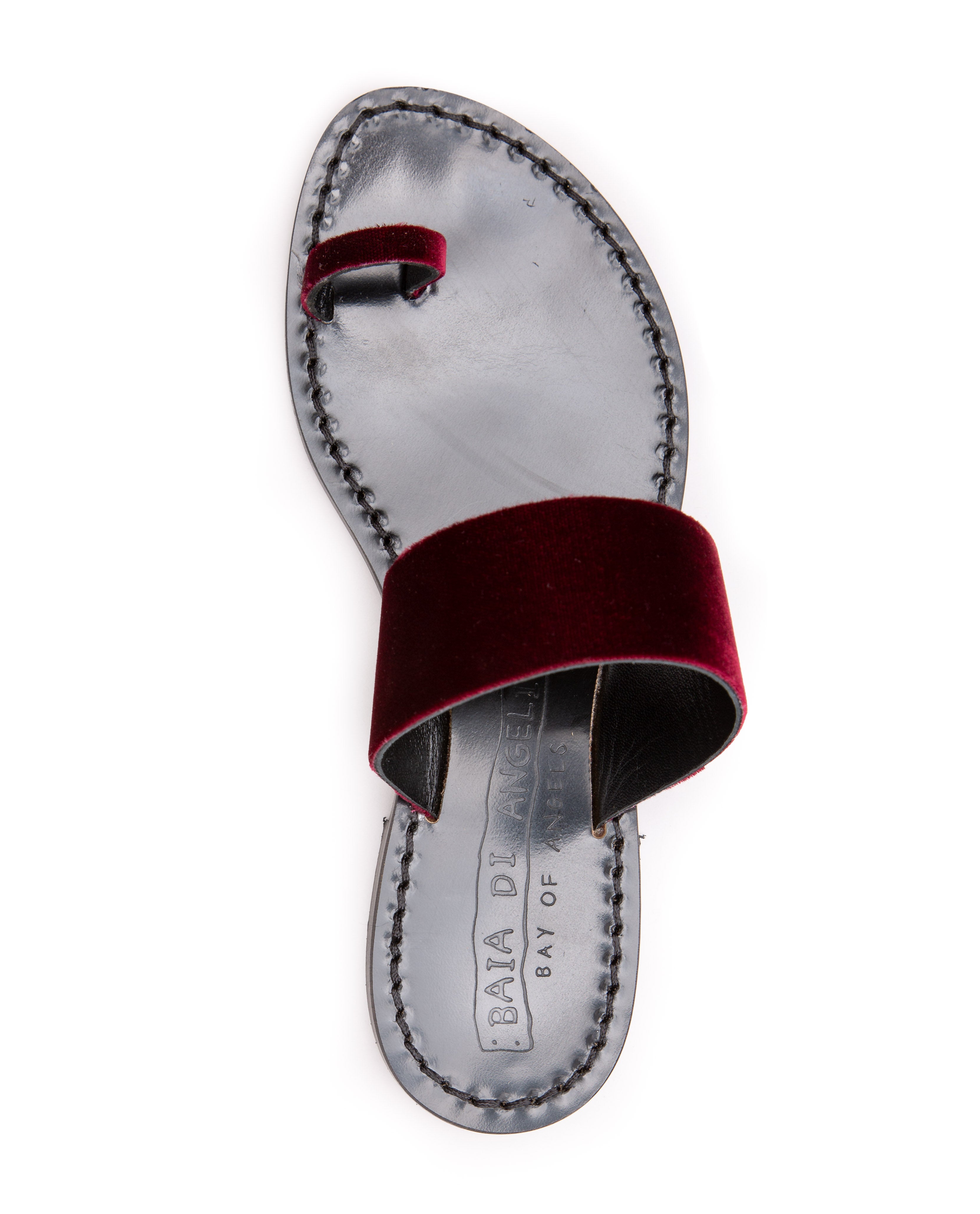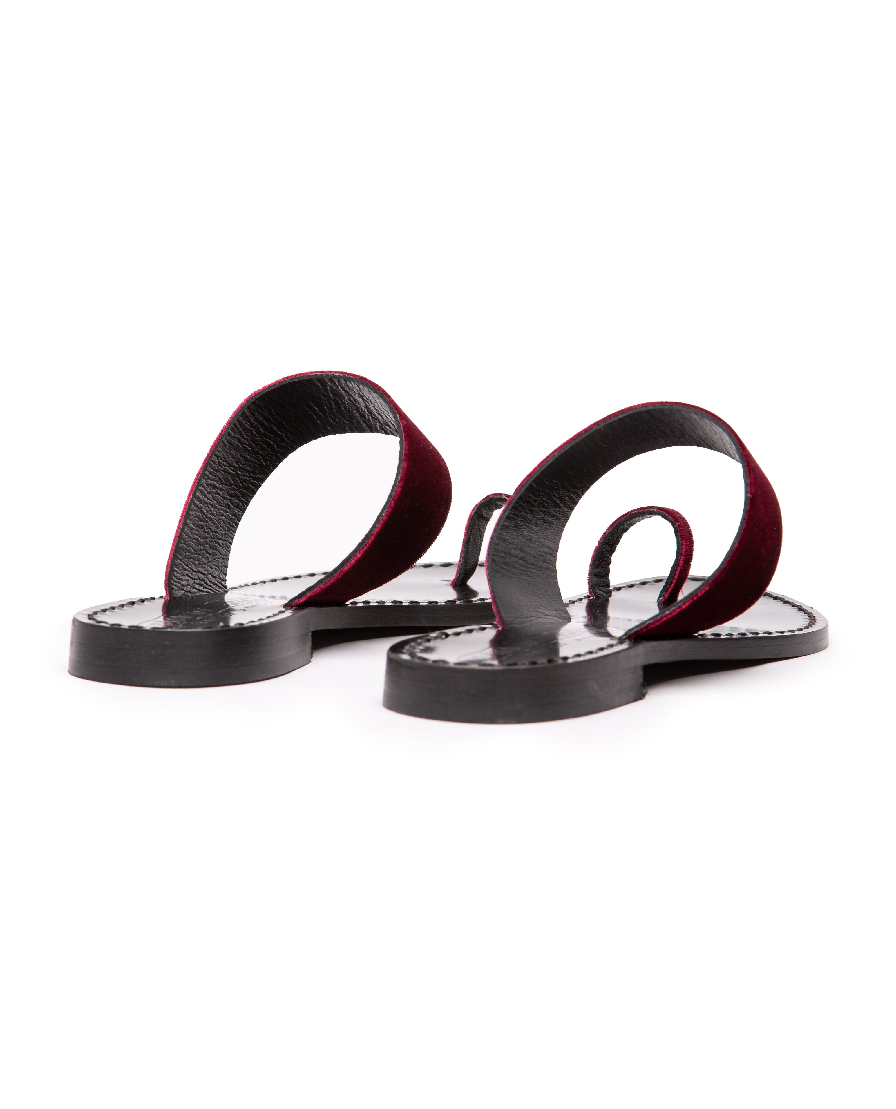 The rich hues of Barolos and louche rock and roll nights inspired these velvet stunners. The Amalfi slide with two simple straps, and one of them is a sexy toe ring, will easily take you from day to night. On a sleek, jet-black base in an opulent, wine-colored velvet.