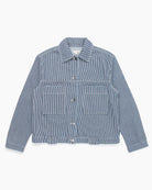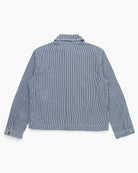 Navy and white railroad stripe jacket by Edyson. This relaxed boyfriend-fit style offers a front button closure and rigid non-stretch fabric with a distressed hem for versatile styling.