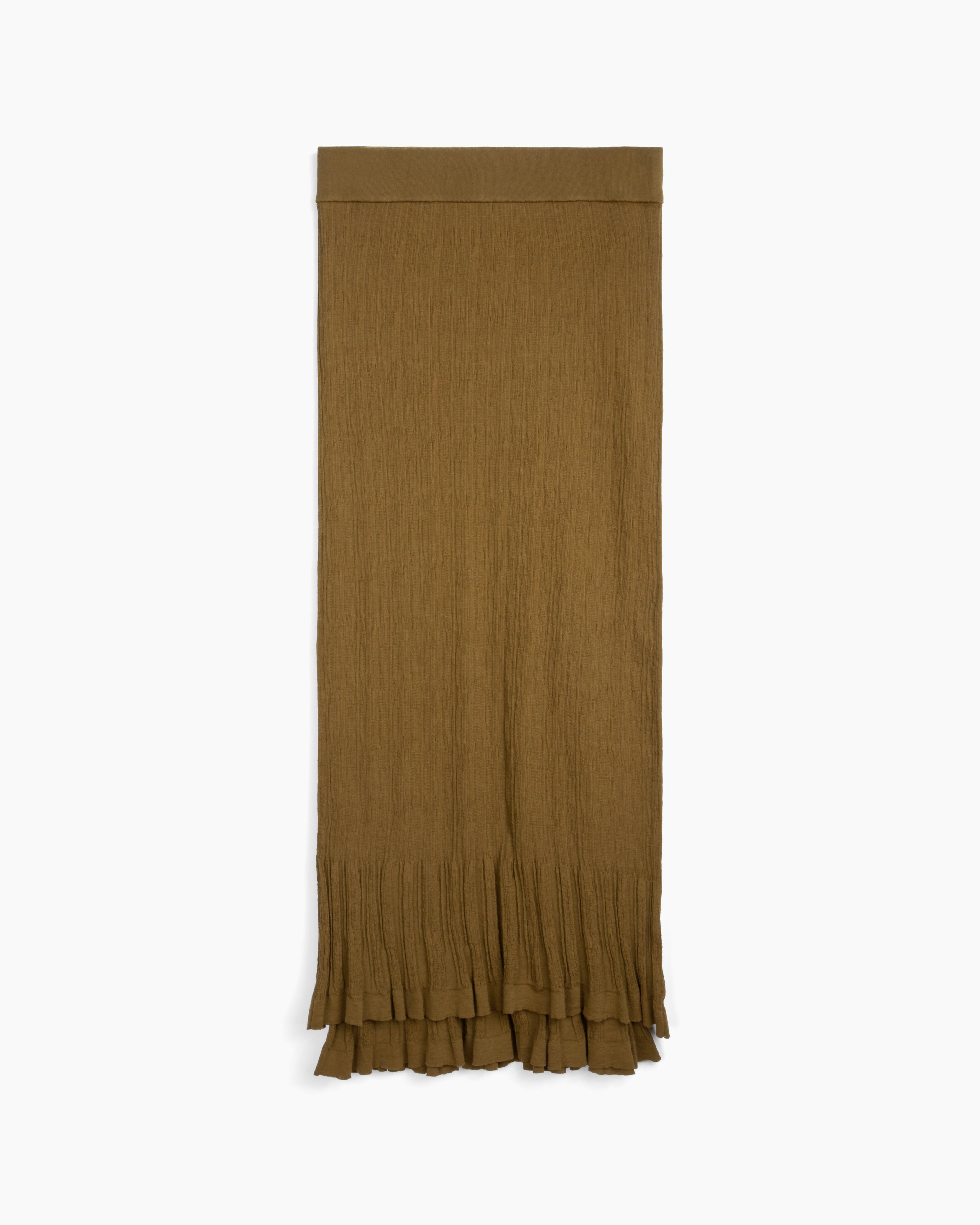 Featuring a midi silhouette, Lexi Skirt in hazel by A.L.C. is crafted from fine gauge cotton-blend yarn in a warm hazelnut brown hue. Tiered pleats at the hem add dynamic movement to this piece.