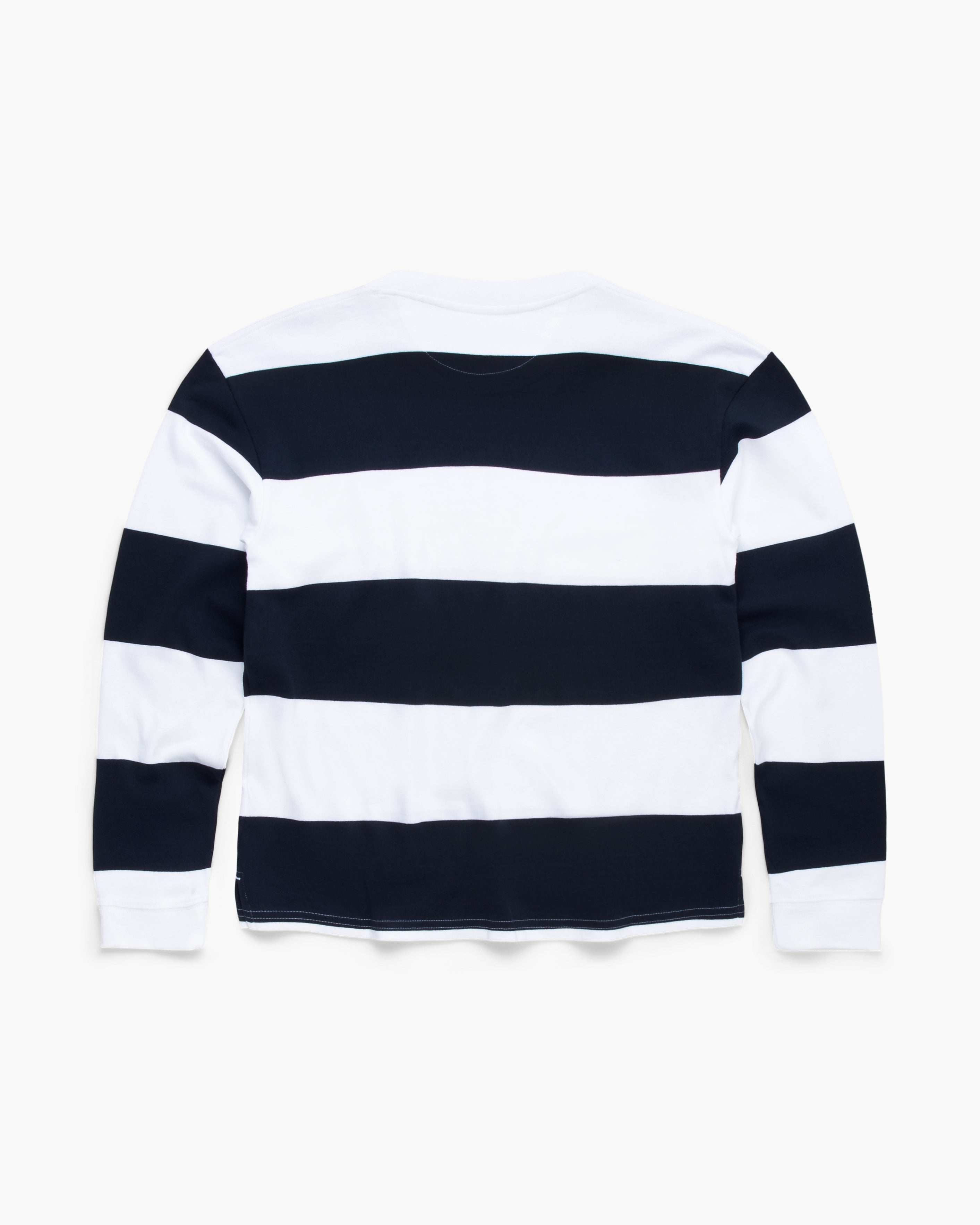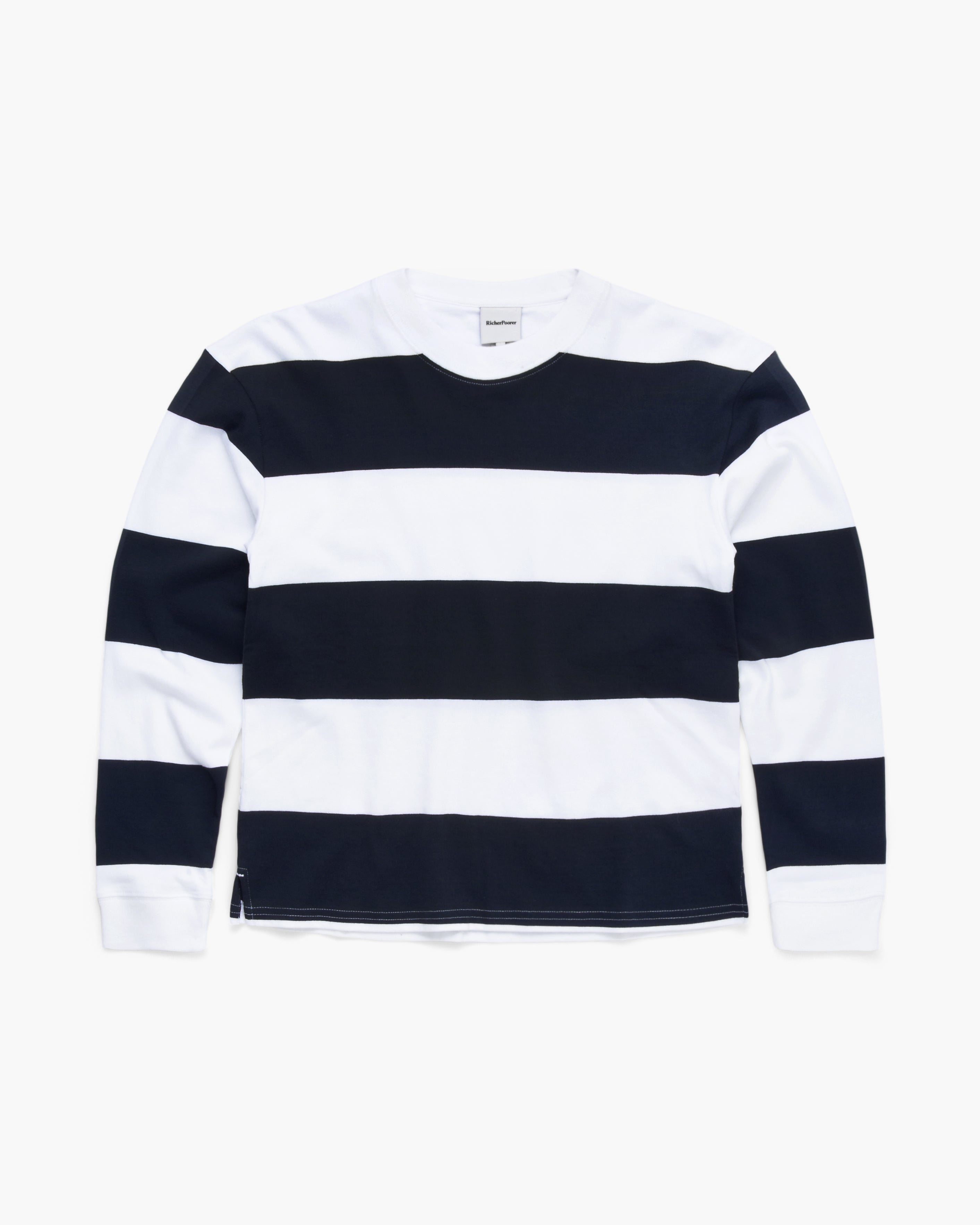 The Rugby Pullover in blue nights stripe by Richer Poorer has a relaxed fit and is made from soft, vintage-style Pima cotton jersey. It features long sleeves, rugby stripes, and ribbed neck and cuffs.