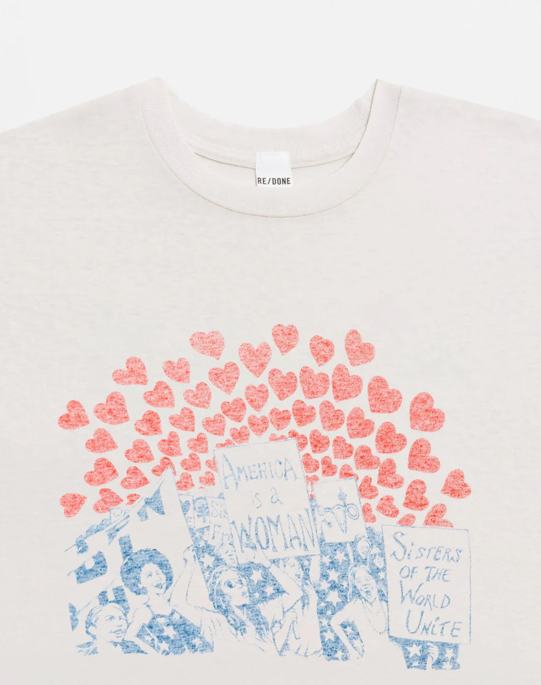 50's Boxy Tee Sisters by RE/DONE x Hanes. Inspired by 1950s menswear, this cropped boxy tee features a relaxed crew neck and loose fit. Crafted from 100% combed cotton and knitted entirely in the USA. Includes collectible vintage-inspired graphic.
