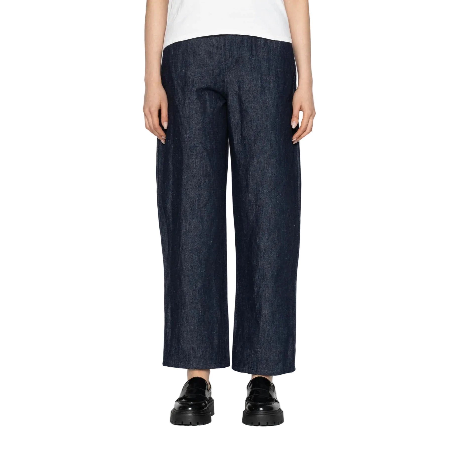 Bestie Jeans by Naked & Famous in linen blend indigo. This mid-rise cropped barrel combines 62% cotton and 38% linen for breathability and durability. The lightweight 8.7oz fabric keeps you cool while the cotton prevents excessive wrinkling. Finished in dark indigo with navy thread and tin hardware.