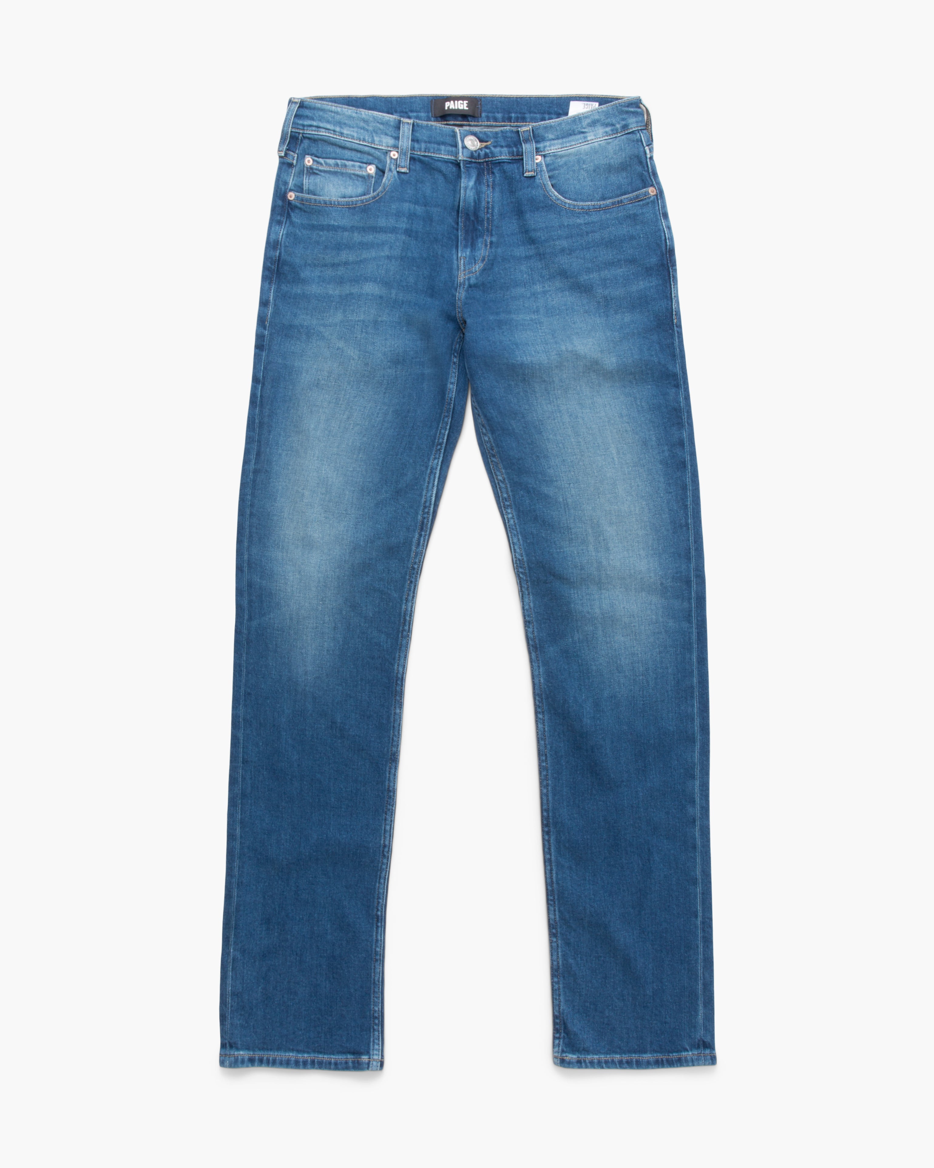 Heritage Normandie Straight Jean by Paige in Daroco medium blue wash. This classic straight fit offers generous room through the hip and leg, crafted from heritage denim with a soft hand-feel and subtle stretch. Features natural fading and contrast seaming.