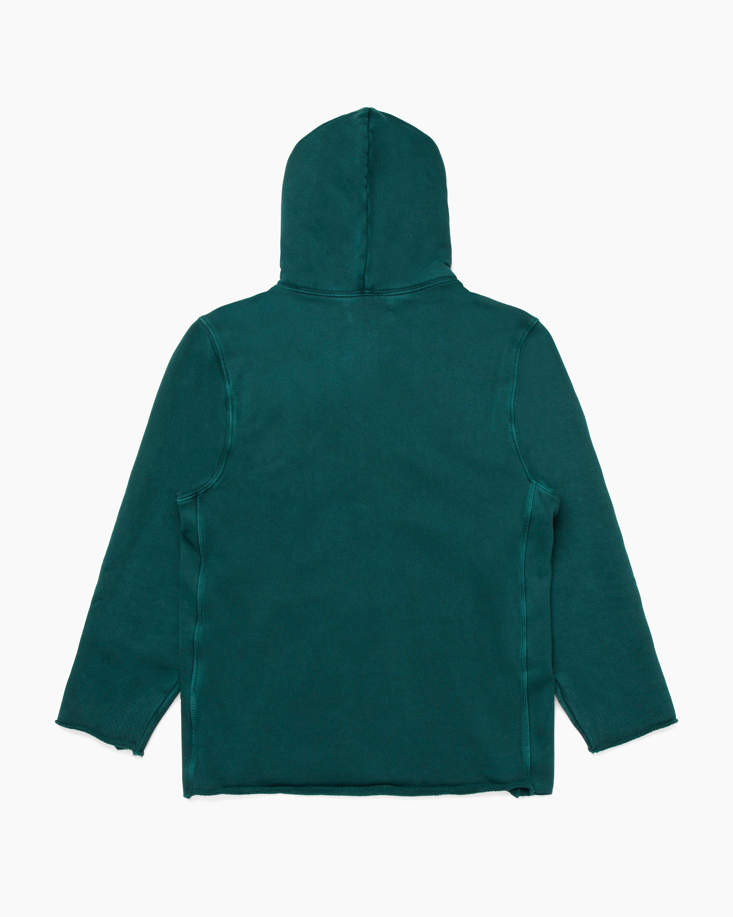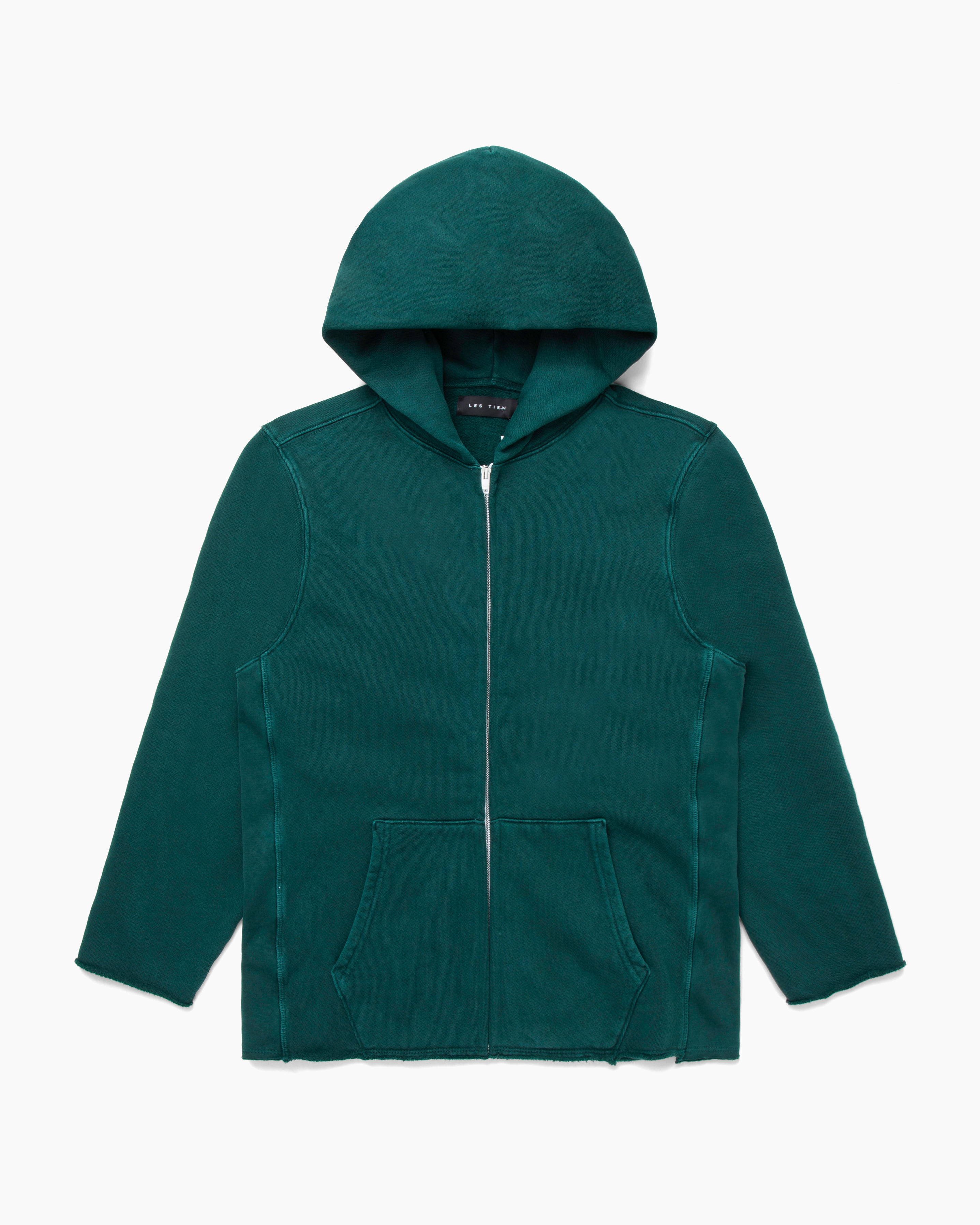 Les Tien's washed emerald green Raw Zip Hoodie features vintage brushed texture and is laundered, pre-shrunk, and garment dyed. With reverse outer stitching cuff details, gold plated Cobrax grommets, and a front Riri zipper closure, this hoodie also includes split front kangaroo pockets and a raw edge finish.